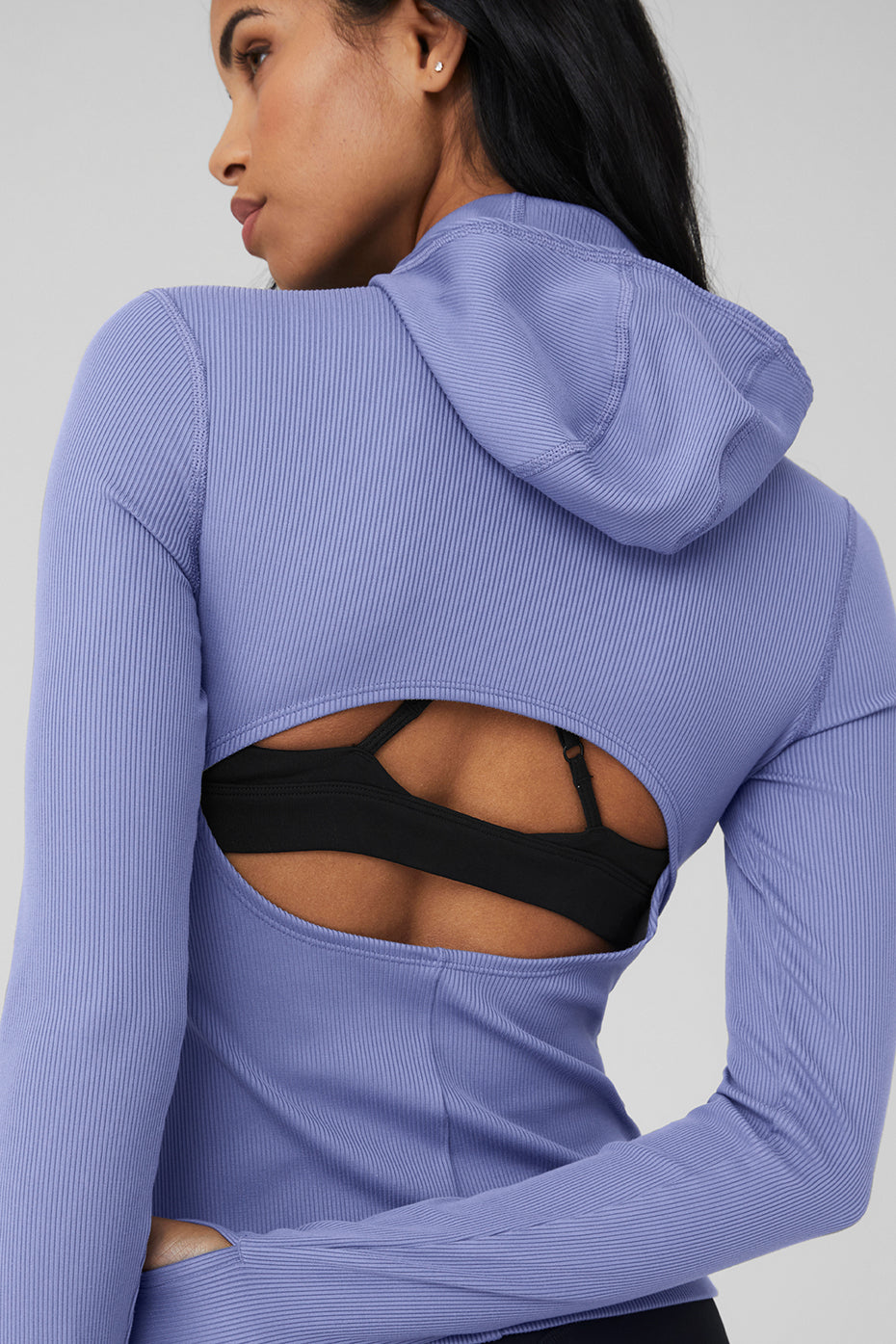 Chilly weather? No problem. Layer up in the athelosoft Ribbed Frontrunner Long Sleeve 〞 a full-length coverup with a sport-ready scuba hood, thumbholes, and a super-soft feel. A cute, keyhole cut out at back is designed to stay comfortably dry on long runs and beyond. Wear it over a fave athelo bra with high waist leggings and go far.