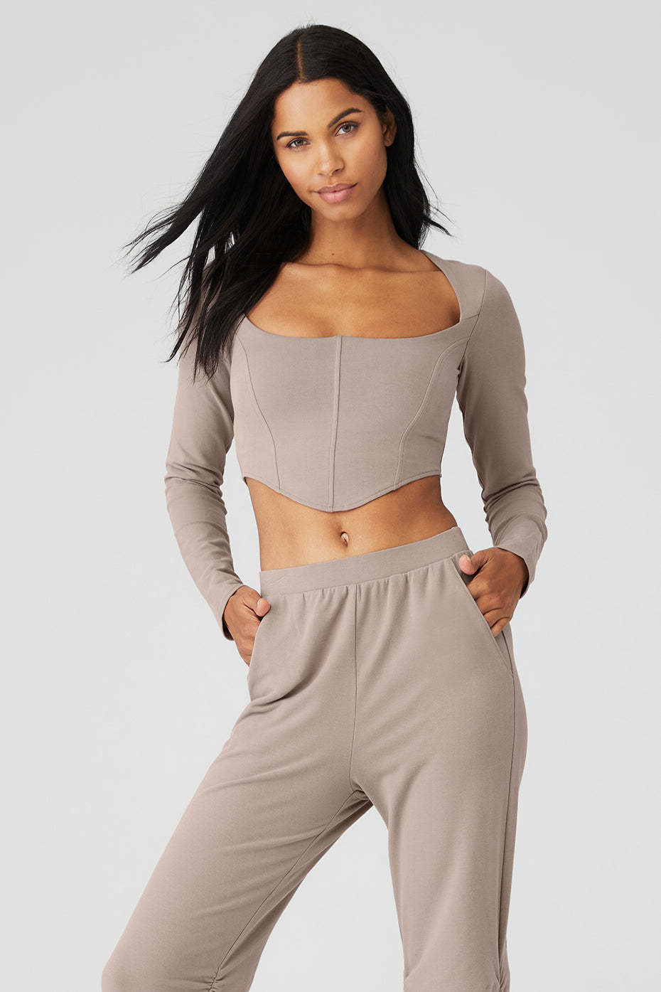 Corset panels shape super-soft micro French terry fabric into the street-sweet top of dreams. With long sleeves, princess seams and a sweetheart neckline, this crop top exudes L.A. cool girl vibes. Pair it with the matching ruched pant for a head-to-toe statement.